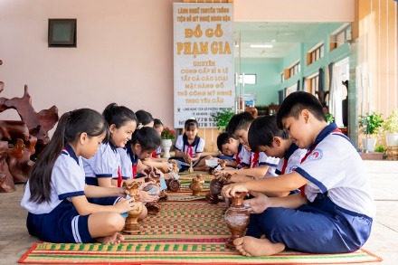 Tại đây, các em học sinh được xem video về quy trình từ khởi đầu đến hoàn thiện một sản phẩm tiện gỗ mỹ nghệ, được tham quan chiêm ngưỡng các sản phẩm được trưng bày tại đây, trải nghiệm làm quen với các hoạt động như chà nhám, vẽ hoa văn lên sản phẩm gỗ... Qua đó, góp phần khơi gợi sự tò mò và yêu thích thủ công, đam mê với nghề truyền thống đối với các em học sinh.