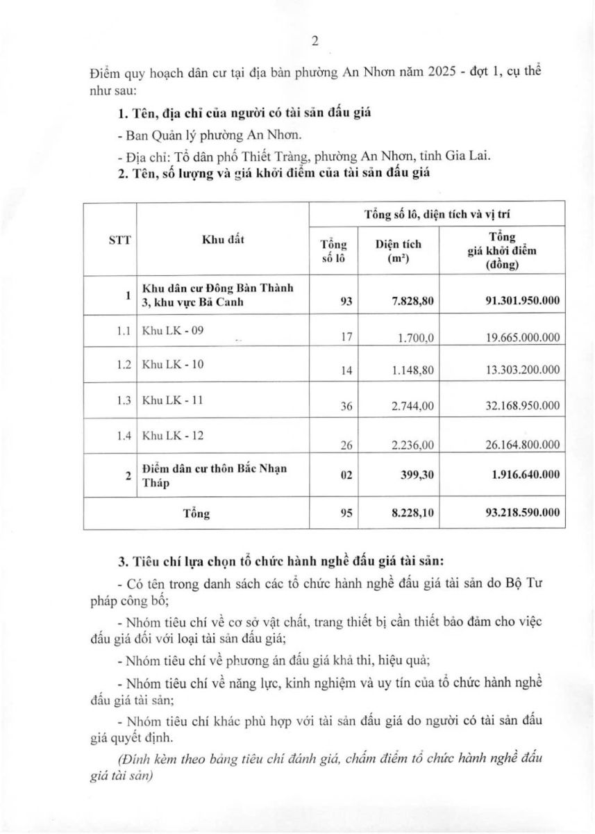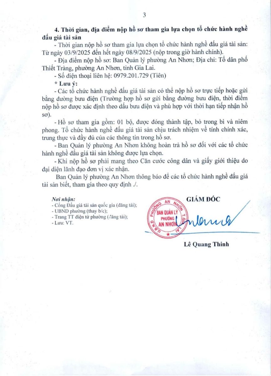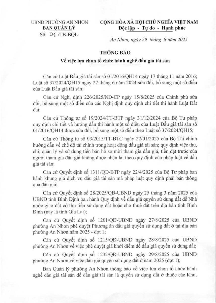 Thứ tư, 03/09/2025 | 14:38 A- A A+ | Thông báo về việc lựa chọn tổ chức hành nghề đấu giá tài sản Chia sẻ Đọc bài Lưu Ban Quản lý phường An Nhơn thông báo về việc lựa chọn tổ chức hành nghề đấu giá tài sản để đấu giá tài sản là quyền sử dụng đất ở thuộc các Khu, Điểm quy hoạch dân cư tại địa bàn phường An Nhơn năm 2025 - đợt 1. Tập tin đính kèm Trình duyệt không hỗ trợ iframe.