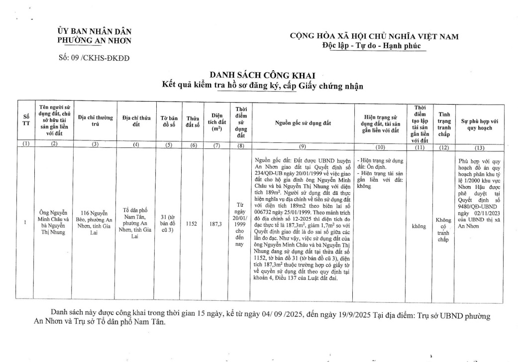 Thứ tư, 17/09/2025 | 10:28 A- A A+ | Danh sách công khai kết quả kiểm tra hồ sơ đăng ký, cấp Giấy chứng nhận hộ ông Nguyễn Minh châu và bà Nguyễn Thị Nhung Chia sẻ Đọc bài Lưu Danh sách công khai kết quả kiểm tra hồ sơ đăng ký, cấp Giấy chứng nhận hộ ông Nguyễn Minh châu và bà Nguyễn Thị Nhung. Tập tin đính kèm Trình duyệt không hỗ trợ iframe.