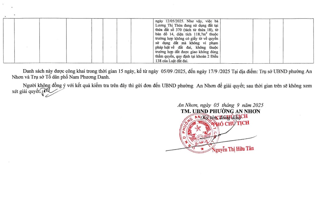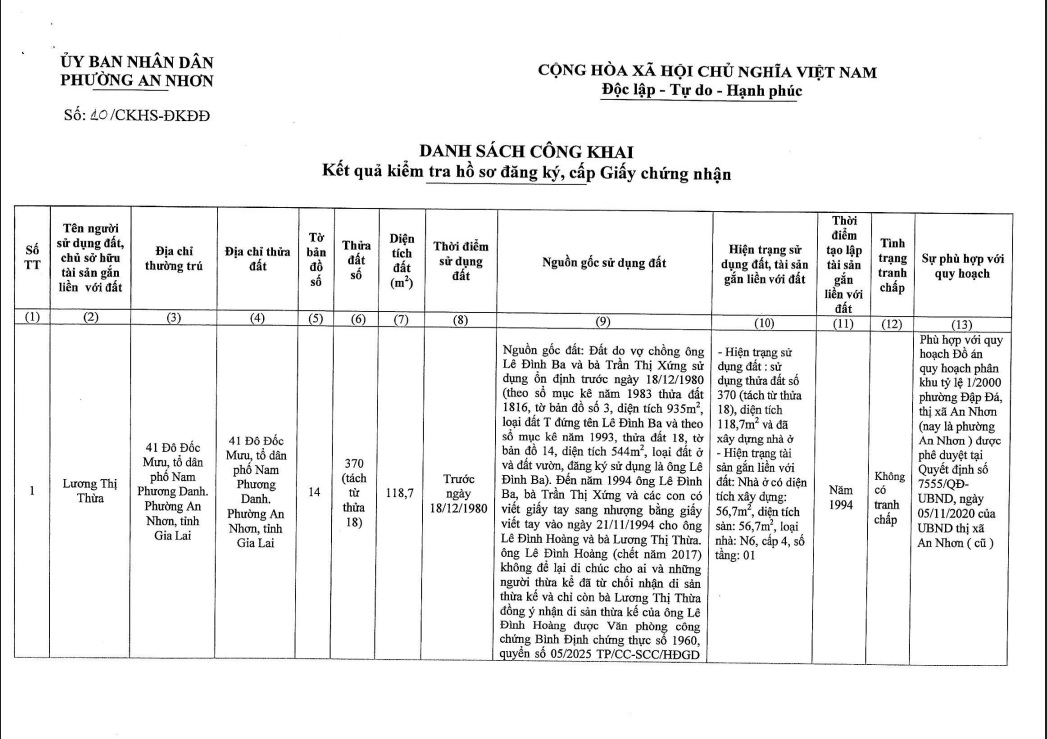 Thứ tư, 17/09/2025 | 10:31 A- A A+ | Danh sách công khai kết quả kiểm tra hồ sơ đăng ký, cấp Giấy chứng nhận hộbà Lương Thị Thừa Chia sẻ Đọc bài Lưu Danh sách công khai kết quả kiểm tra hồ sơ đăng ký, cấp Giấy chứng nhận hộbà Lương Thị Thừa. Tập tin đính kèm Trình duyệt không hỗ trợ iframe.