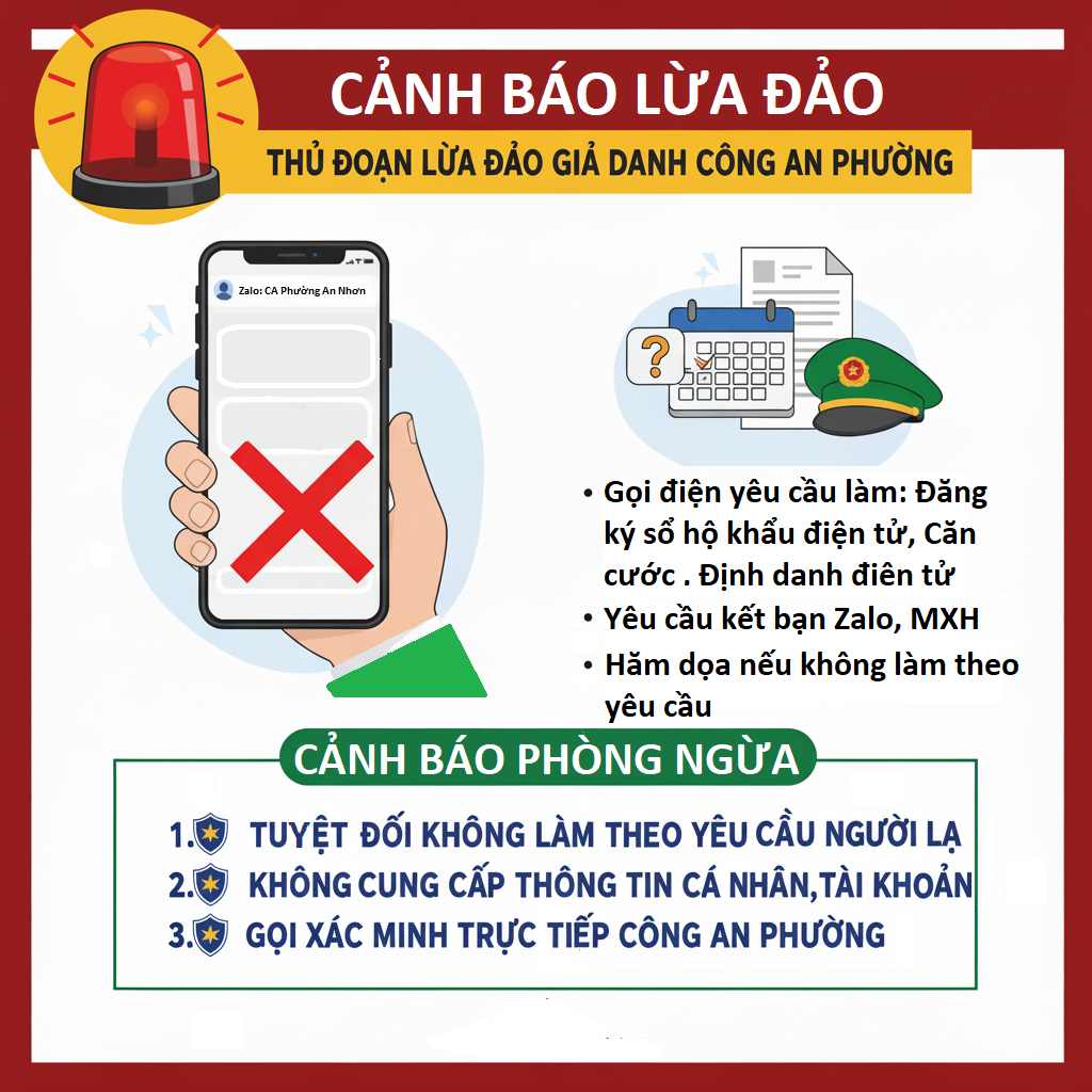 Những ngày gần đây có một số đối tưởng giả danh Công an phường gọi điện thoại người dân đến Công an phường để đăng ký sổ hộ khẩu điện tử, làm căn cước cho con, làm định danh điện tử, yêu cầu kết bạn zalo, mạng xã hội để hướng dẫn... hăm doạ nếu ko làm theo... Công an phường kính thông báo bà con biết, không làm theo yêu cầu người lạ, cảnh giác phòng ngừa, để không bị lừa mất tiền!