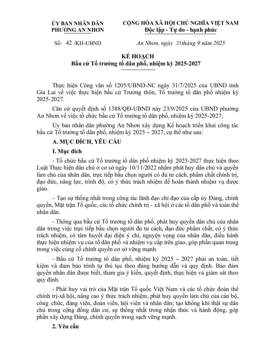 Thứ bảy, 27/09/2025 | 20:56 A- A A+ | Phường An Nhơn ban hành kế hoạch bầu cử Tổ trưởng Tổ dân phố, nhiệm kỳ 2025-2027 Chia sẻ Đọc bài Lưu Ngày 23 tháng 9 năm 2025, UBND phường An Nhơn ban hành kế hoạch số 42 bầu cử Tổ trưởng Tổ dân phố, nhiệm kỳ 2025-2027. Tập tin đính kèm Trình duyệt không hỗ trợ iframe.