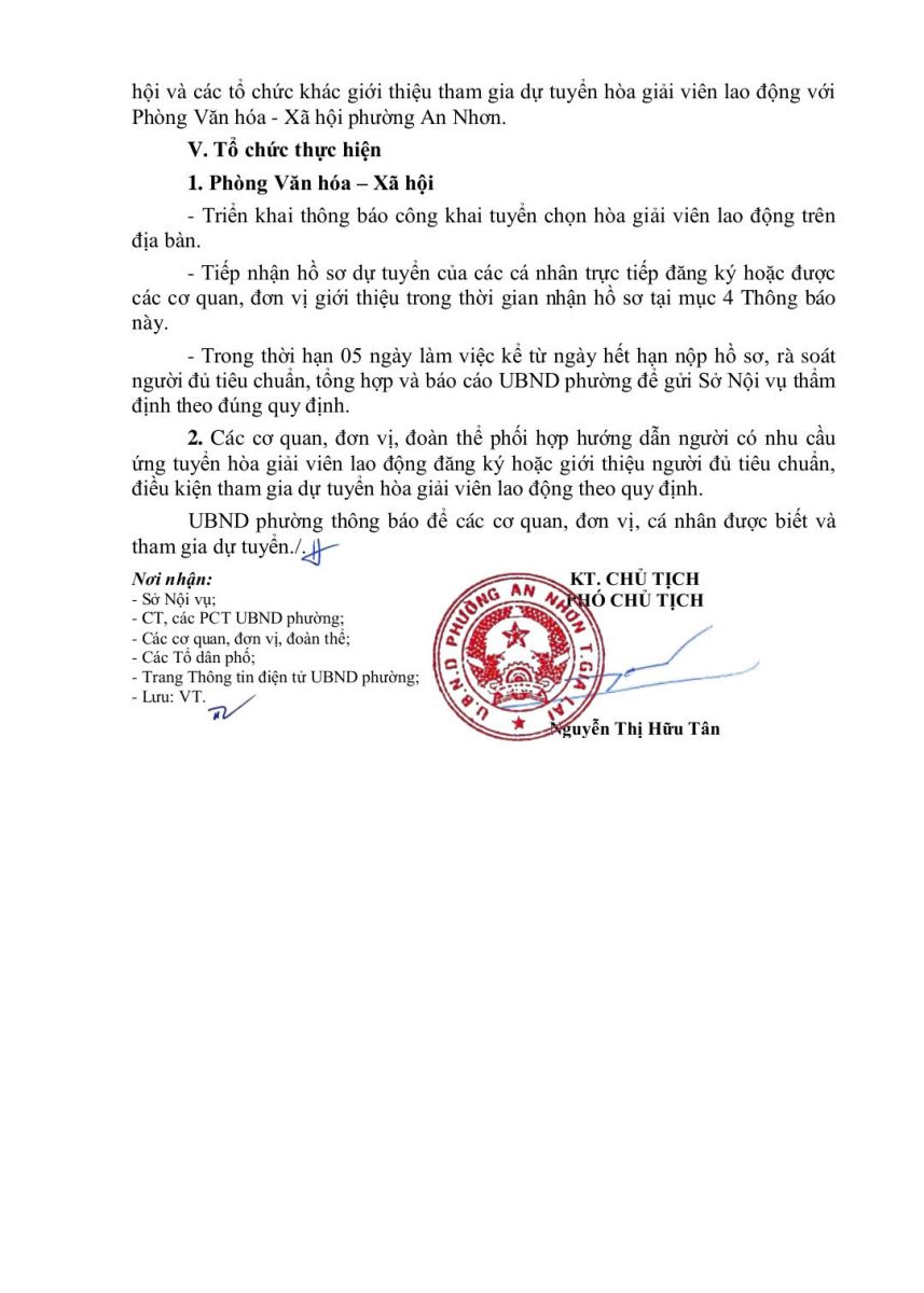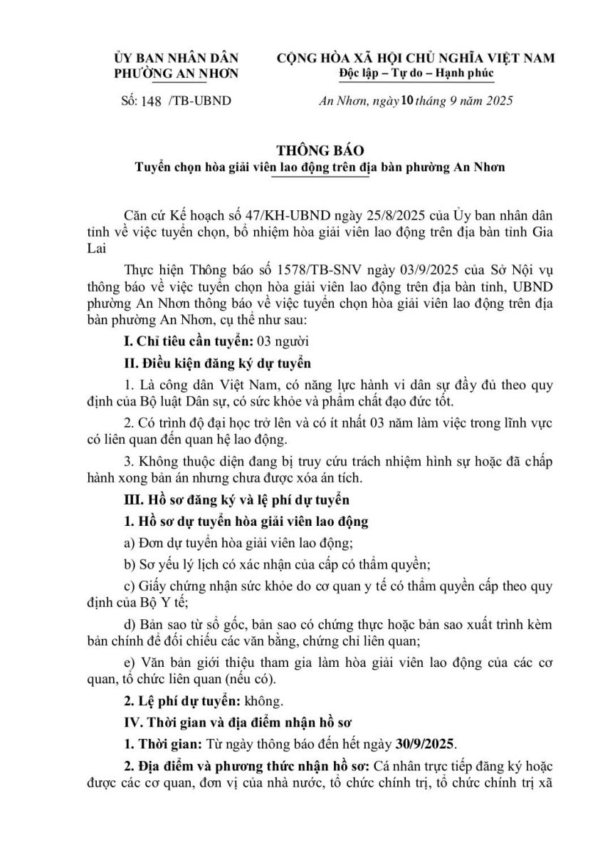Thực hiện Thông báo số 1578/TB-SNV ngày 03/9/2025 của Sở Nội vụ thông báo về việc tuyển chọn hòa giải viên lao động trên địa bàn tỉnh, UBND phường An Nhơn thông báo về việc tuyển chọn hòa giải viên lao động trên địa bàn phường An Nhơn.