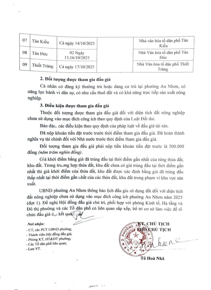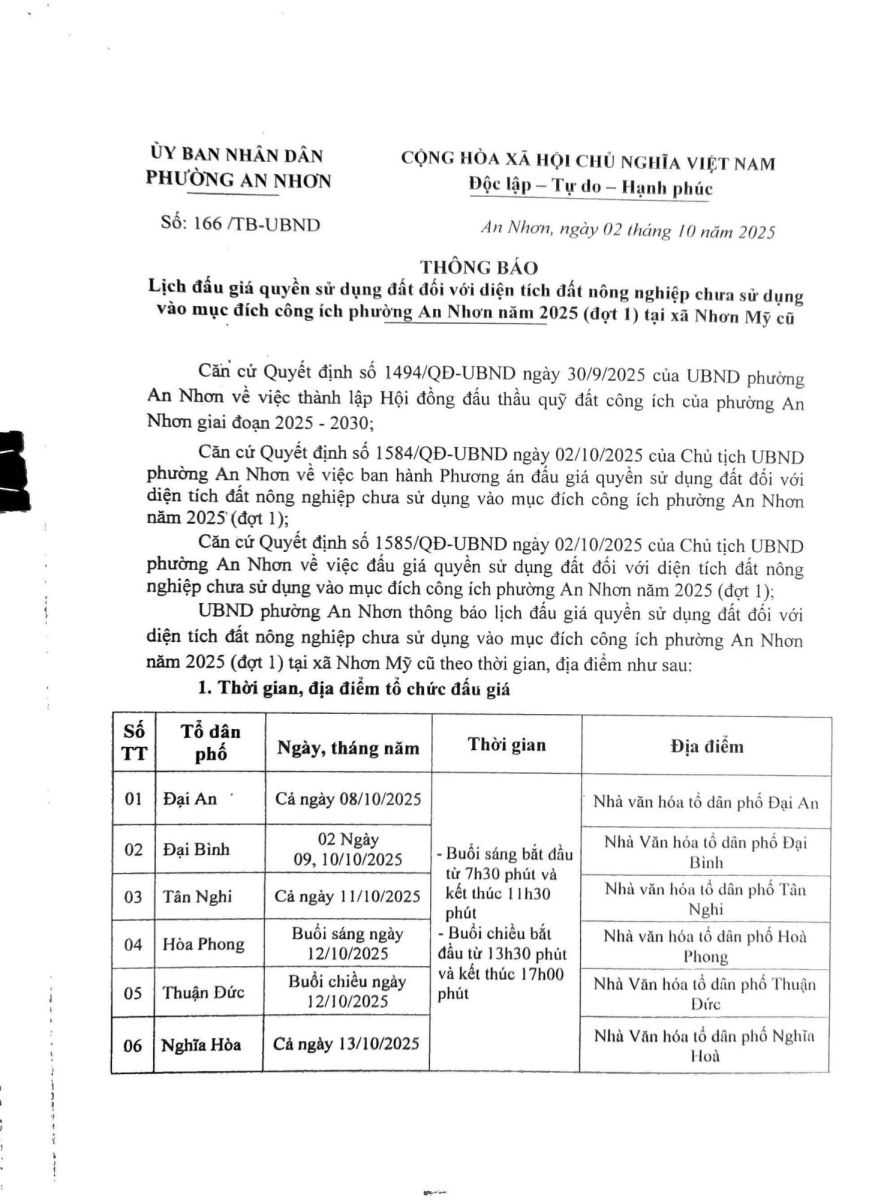 Căn cứ Quyết định số 1494/QĐ-UBND ngày 30/9/2025 của UBND phường An Nhơn về việc thành lập Hội đồng đấu thầu quỹ đất công ích của phường An Nhơn giai đoạn 2025 - 2030; Quyết định số 1584/QĐ-UBND ngày 02/10/2025 của Chủ tịch UBND phường An Nhơn về việc ban hành Phương án đấu giá quyền sử dụng đất đối với diện tích đất nông nghiệp chưa sử dụng vào mục đích công ích phường An Nhơn năm 2025 (đợt 1); Quyết định số 1585/QĐ-UBND ngày 02/10/2025 của Chủ tịch UBND phường An Nhơn về việc đấu giá quyền sử dụng đất đối với diện tích đất nông nghiệp chưa sử dụng vào mục đích công ích phường An Nhơn năm 2025 (đợt 1). UBND phường An Nhơn thông báo lịch đấu giá quyền sử dụng đất đối với diện tích đất nông nghiệp chưa sử dụng vào mục đích công ích phường An Nhơn năm 2025 (đợt 1) tại xã Nhơn Mỹ cũ theo thời gian, địa điểm như sau:
