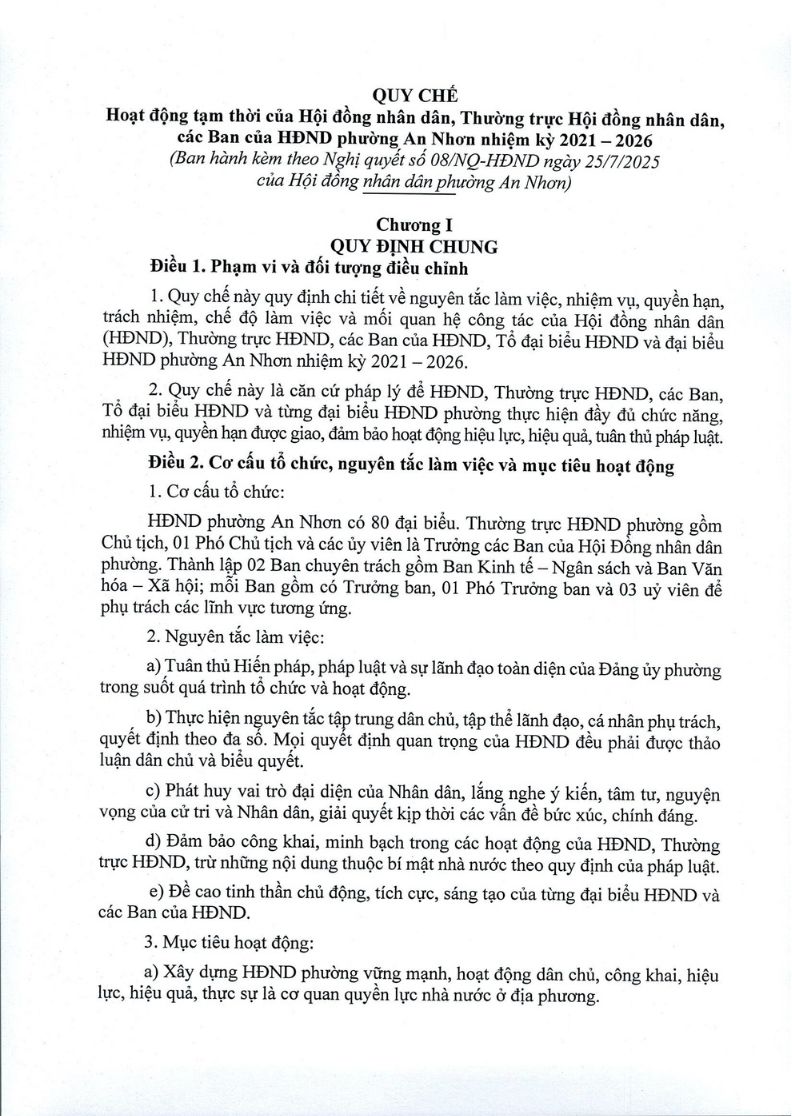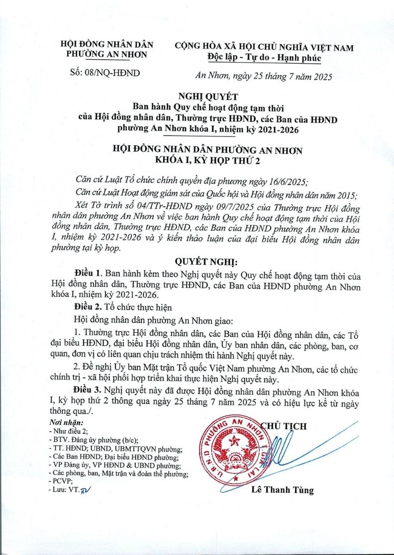 Nghị quyết số 08/NQ-HĐND ngày 25/7/2025 của HĐND phường An Nhơn về ban hành Quy chế hoạt động tạm thời của Hội đồng nhân dân, Thường trực HĐND, các Ban của HĐND phường An Nhơn khóa I, nhiệm kỳ 2021-2026