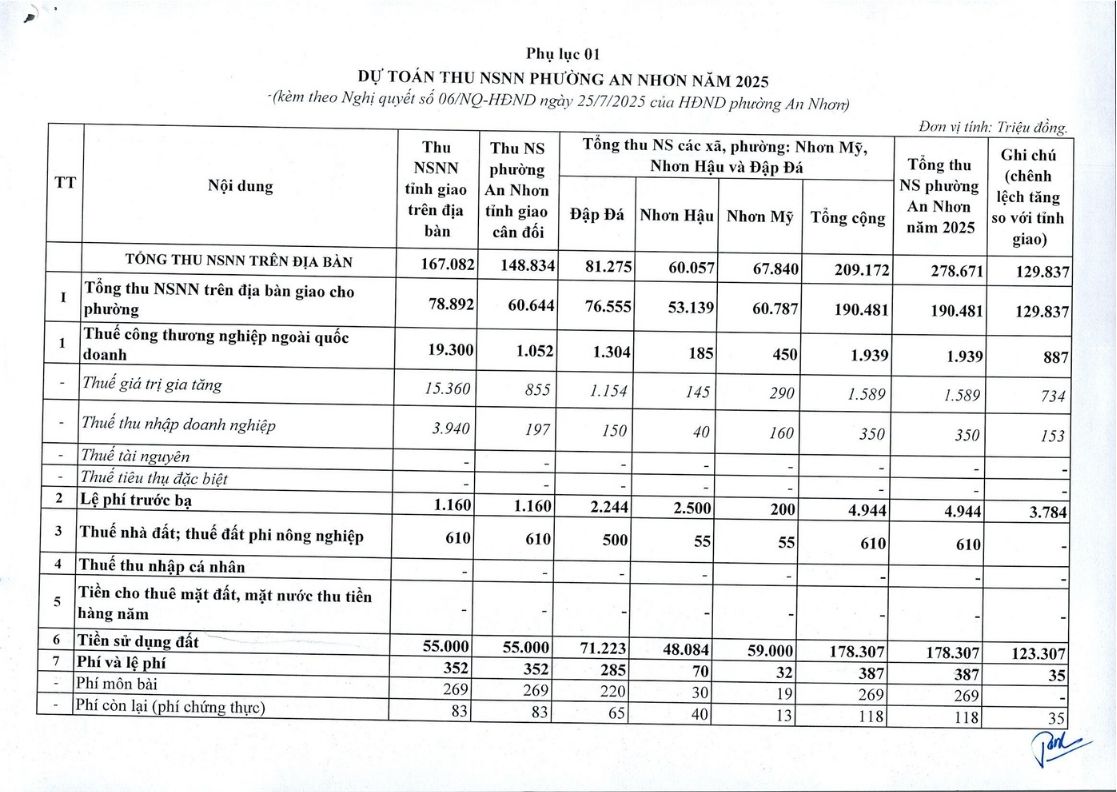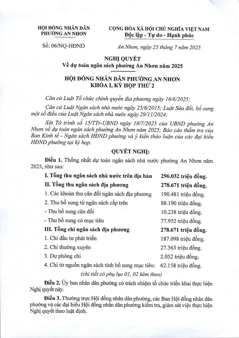 Thứ năm, 23/10/2025 | 19:32 A- A A+ | Nghị quyết về dự toán ngân sách phường An Nhơn năm 2025 Chia sẻ Đọc bài Lưu Nghị quyết số 06/NQ-HĐND ngày 25 tháng 7 năm 2025 của HĐND phường An Nhơn về dự toán ngân sách phường An Nhơn năm 2025