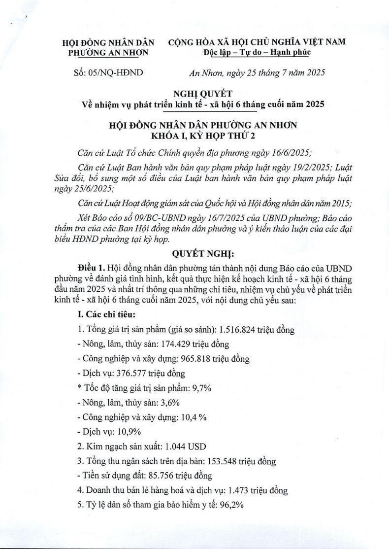 Thứ năm, 23/10/2025 | 19:28 A- A A+ | Nghị quyết về nhiệm vụ phát triển kinh tế - xã hội 6 tháng cuối năm 2025 Chia sẻ Đọc bài Lưu Nghị quyết số 05/NQ-HĐND ngày 25 tháng 7 năm 2025 của HĐND phường An Nhơn về nhiệm vụ phát triển kinh tế - xã hội 6 tháng cuối năm 2025