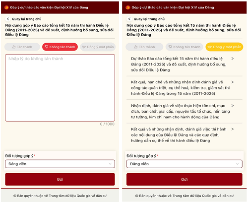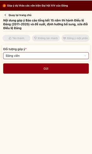- Nếu đồng ý với toàn bộ nội dung dự thảo văn kiện: chọn “Tán thành”, sau đó chọn “Đối tượng góp ý” và nhấn “Gửi”.