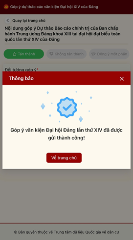 Bước 4: Màn hình hiển thị thông báo gửi góp ý về dự thảo các Văn kiện Đại hội Đảng thành công. Nhấn Về trang chủ để quay lại màn danh sách dự thảo các Văn kiện Đại hội.