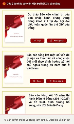 Nội dung lấy ý kiến tập trung vào ba văn kiện chính: Dự thảo Báo cáo chính trị của Ban Chấp hành Trung ương Đảng khóa XIII trình Đại hội XIV; Báo cáo tổng kết một số vấn đề lý luận và thực tiễn về công cuộc đổi mới theo định hướng xã hội chủ nghĩa trong 40 năm; Báo cáo tổng kết 15 năm thi hành Điều lệ Đảng (2011-2025) cùng đề xuất sửa đổi, bổ sung.